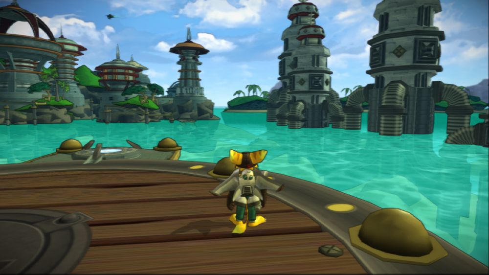 This culminates in the Hydro Pack, a backpack that is automatically equipped when underwater. With a click of the R1 button it activates, automatically propelling Ratchet through the water, where you only need to control depth and direction. This is needed to access some hidden areas for both Gold Bolts and upgrade items, as the normal swimming speed is nowhere near fast enough.