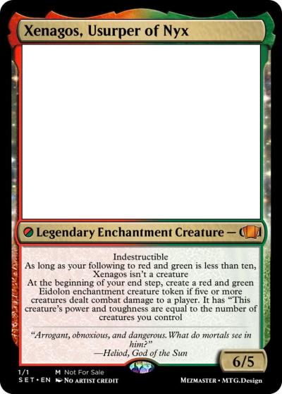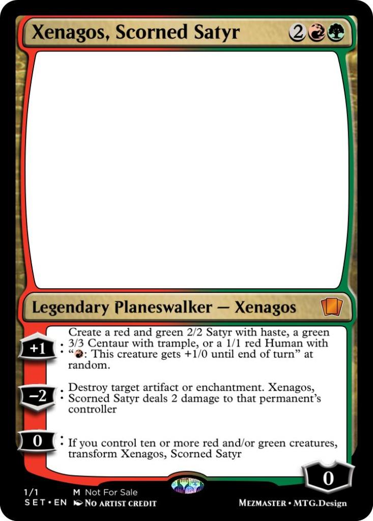 And, as with Scorned Satyr, I’m keeping this Xenagos in line with his existing counterpart by making his power and toughness 6/5.