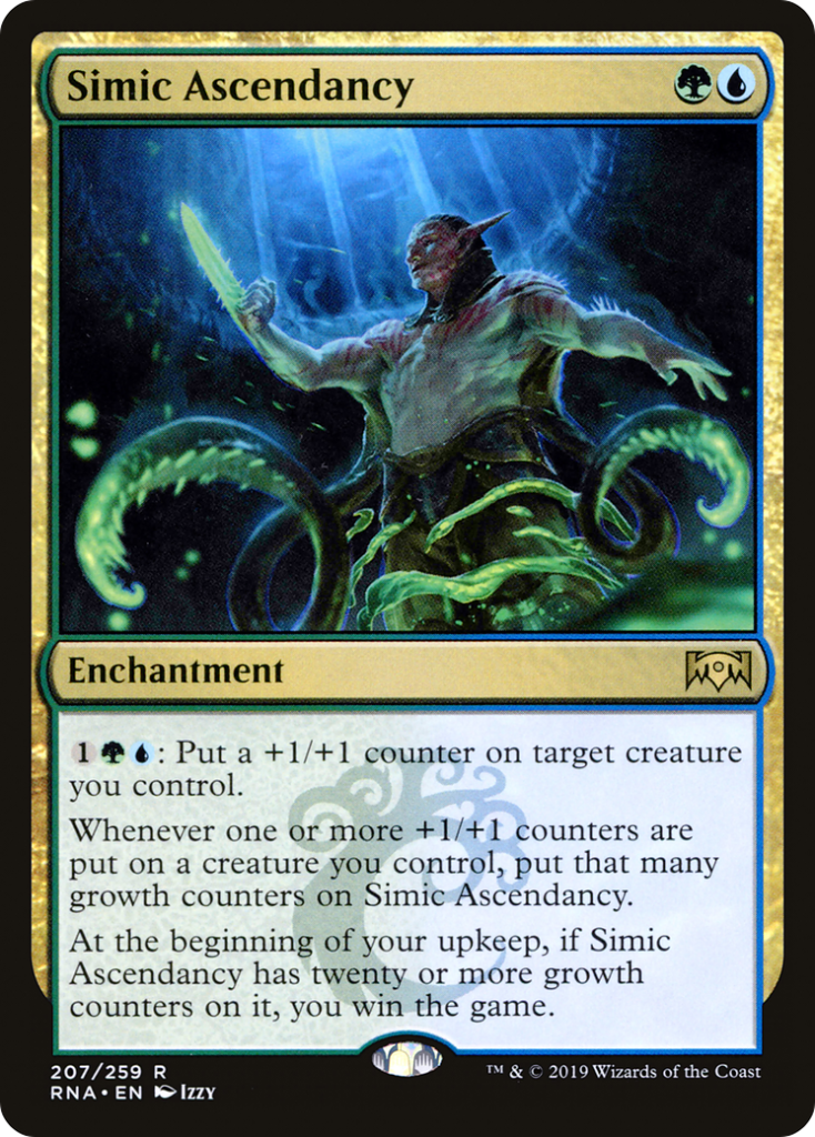 Simic Ascendancy is one of the more straight forward alternate victory cards, simply requiring for 20 +1/+1 counters to be placed on your creatures and to reach your next upkeep step. This counter can be accelerated through the mechanic Proliferate, which not only lets you add extra counters onto creatures; it also lets you add counters directly onto Ascendancy itself.