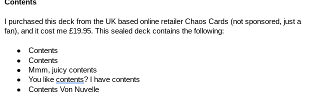 This isn’t related to the review or anything, but as I was drafting this review out I wrote the contents section and filled it with a few silly throwaway jokes… problem is I find my own joke here too funny for my own good, so I feel a need to include it here now.