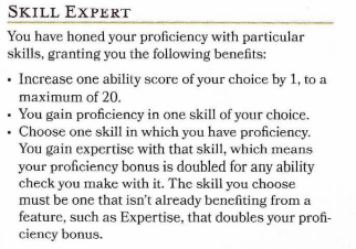 A note about the Unearted Arcana feat “Practiced Expert”. It is essentially the same as Skill Expert but instead of being restricted to just skills, you can also choose tools to gain proficiency/expertise in. This does offer more flexibility, but can be quite campaign/character specific depending on what kind of artisans tools characters may be used. And as always with UA, ask your DM first if it is okay to use it.