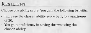 Mentioned previously, Resilient is a very straightforward feat. You pick an ability score to increase by one, and you subsequently gain proficiency in that score’s saving throw.