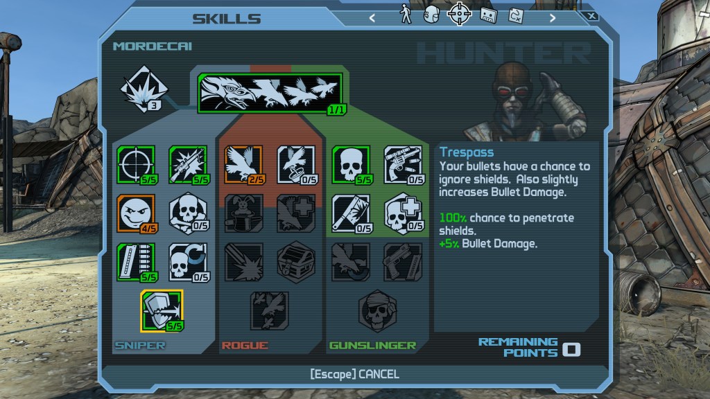 Mordecai is the “Hunter” class of the game, with skill trees focusing on his pet Bloodwing, the usage of pistols, and my preferred tree of choice: Sniping. Whilst the trees are much smaller compared to later entries; Mordecai’s sniping tree is beautifully simple in its execution, boosting damage, ammo capacity, and ending off on a capstone of bypassing shields once fully levelled up.