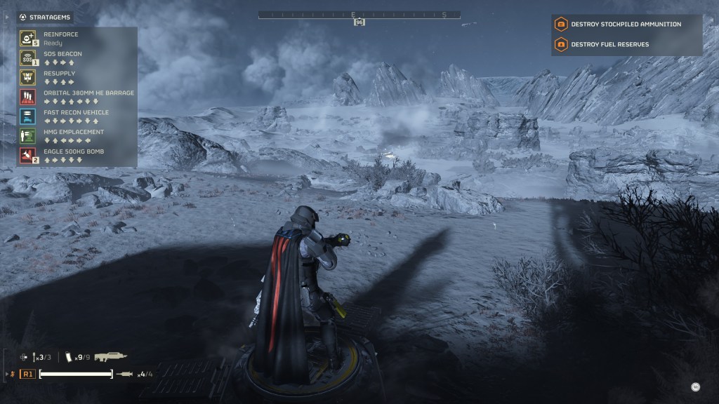 After which you are presented with your objective, which can range from collecting geological samples, destroying enemy supply lines, to the most important task of them all: raising the flag of Super Earth to bring democracy to all.