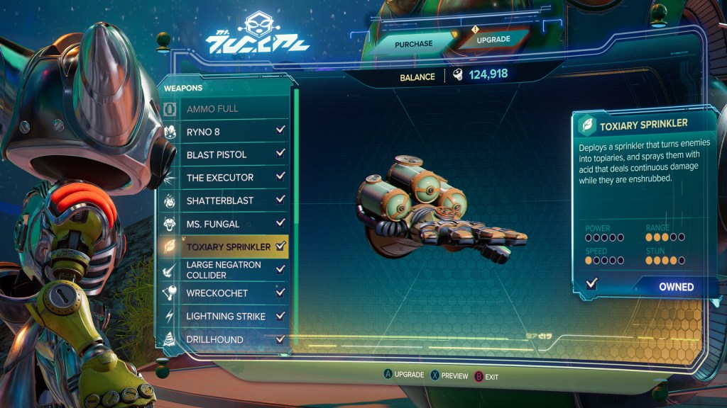 The Topiary/Toxiary Sprinkler is your typical enemy disabling weapon present in the franchise, giving you a chance to switch to a more powerful weapon to deal unabashed damage, In this instance, it takes the form of a sprinkler that will turn any enemies (even big massive bosses) into decorative topiaries of themselves for a short while. A silly and entertaining take on a standard weapon class.