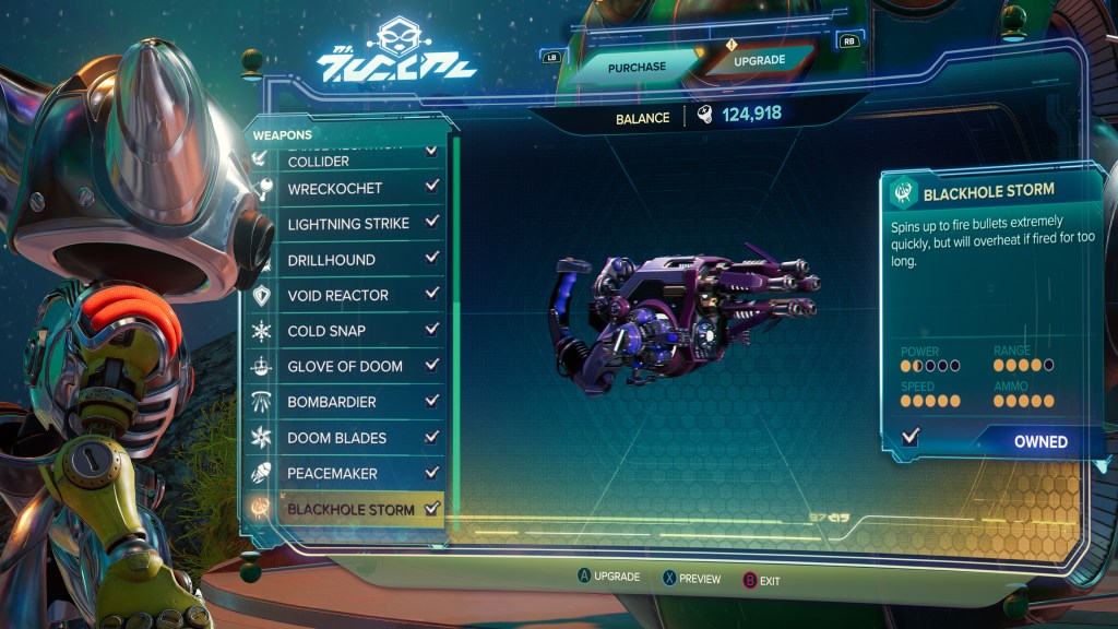 Finally, we have the Blackhole Storm/Blackhole Vortex, a rapid firing gatling gun that is unlocked fairly late into the story, but is incredibly worth it once picked up. Taking some time to spin up, it will unleash a torrent of miniature black holes, raining antimatter death upon your enemies… until it overheats, after which point it needs some time to cool down.