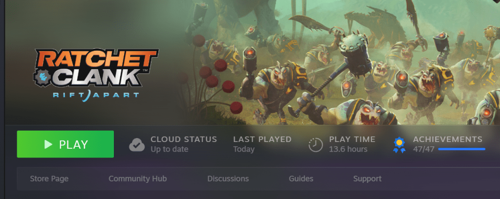 As shown in my achievements image, it did not take me long to 100% this game, having finished the remaining achievements only an hour or so into my New Game+ save, but I consider that time fully worth it. There were no instances of me being disappointed by any planet, the setpieces were fantastic and the combat has evolved for the modern day with features such as a dodge move and the rift tethering mechanic.