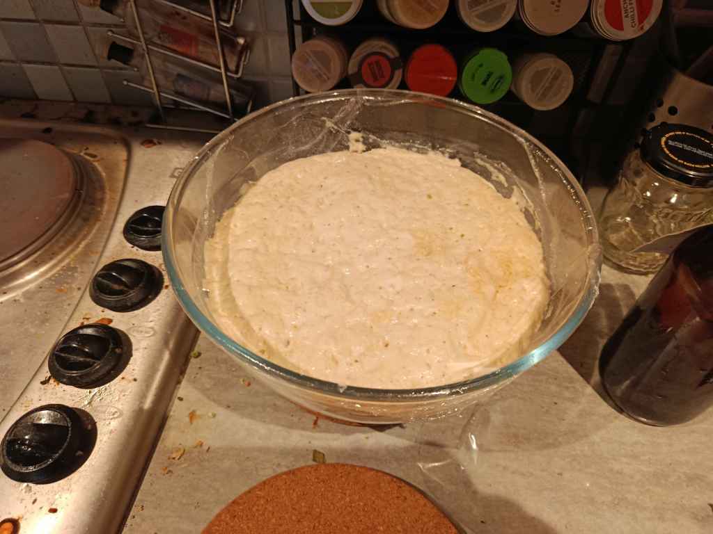 The basis that I used for making this loaf was a Basics With Babish video where he goes through Jim Lahey’s No-Knead bread technique, mixing together flour, water, yeast, and salt before leaving it to ferment for twenty-four hours to make a very inflated and sticky dough.