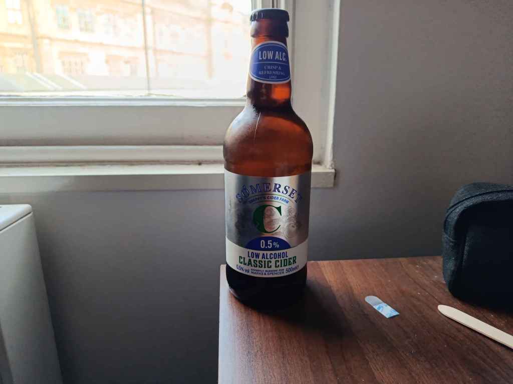 Several hours and one gashed knuckle later (damn knife sharpeners), I was finally able to try what I wanted to review: a low-alcohol cider from Marks & Spencer (M&S)