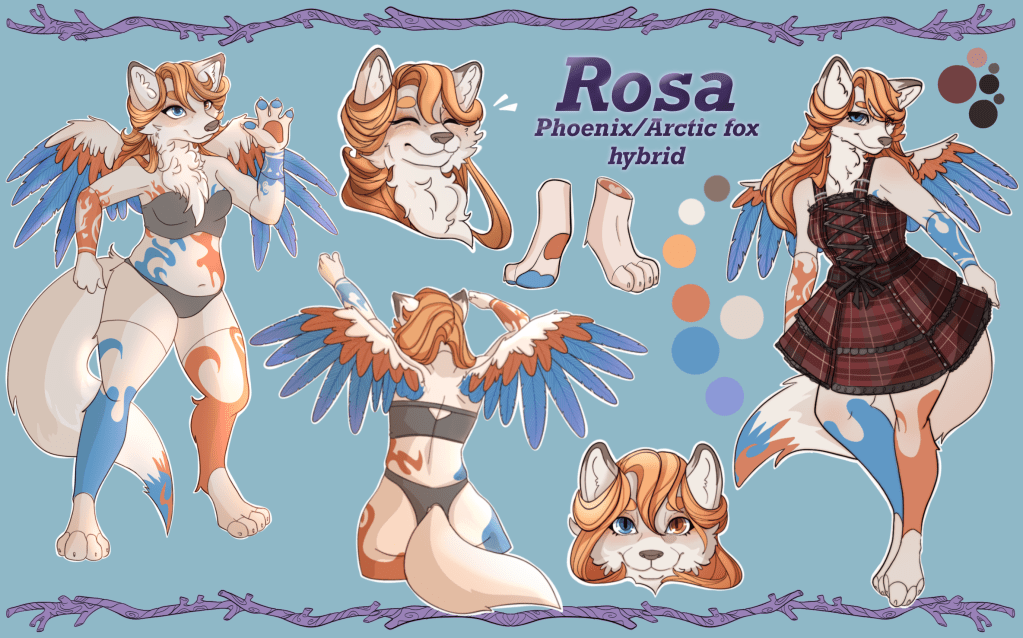 Meet Rosa, the Arctic Fox & Phoenix hybrid. She is essentially my “truesona”, being a reflection of myself more than an actual character I would embody, down to her having similar proportions to what my actual body looks like IRL. This reference sheet was drawn by my friend Ely, who I think did a fantastic job with the entire thing.