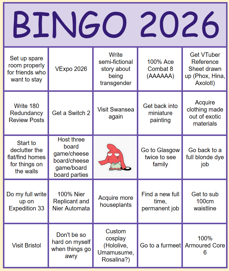 Did one of these last year with my friends, and considering how well it went we have decided to do another round. I feel my card this year is a bit more toned down compared to the goals I set last year, there are some new ones entirely, some based around travel, and a couple of returning goals that I would definitely love to see.