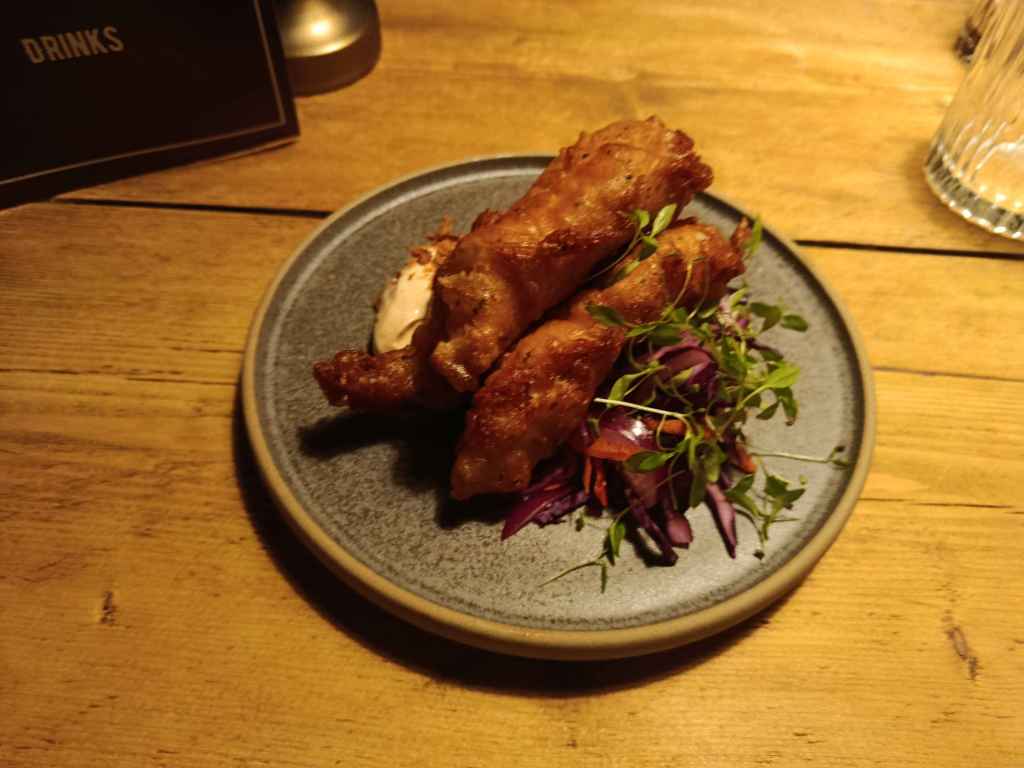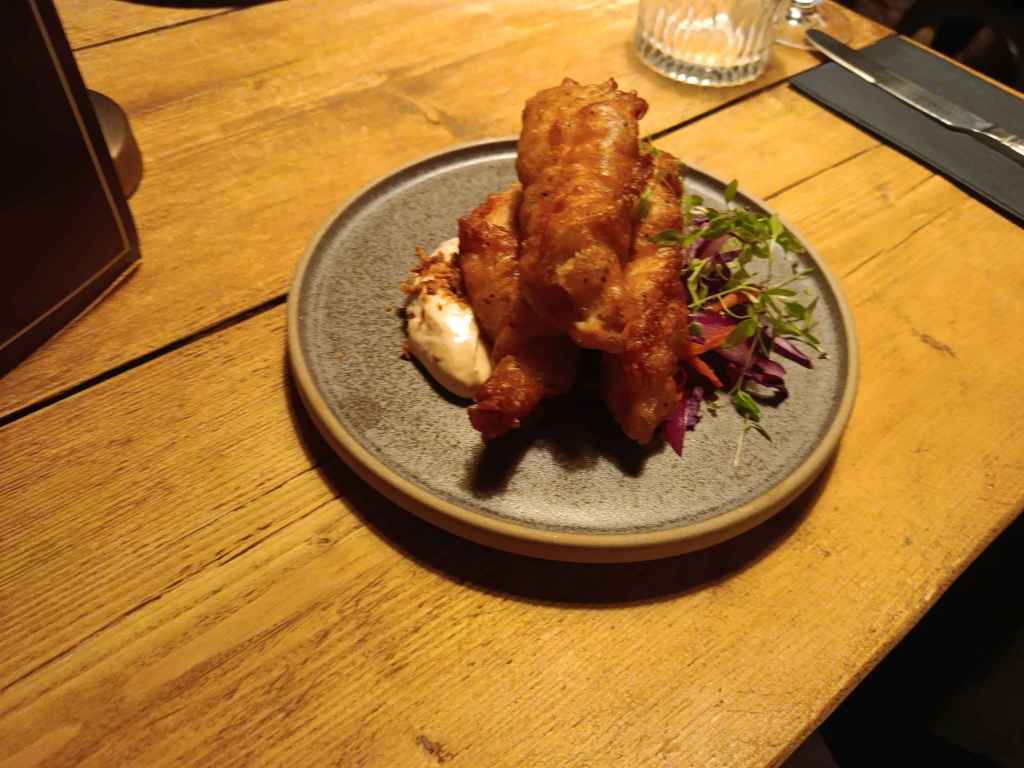 For starters, my selection was the twice fried chicken, served with what was described as “chicken skin mayonnaise” which seemed like a spiced mayo with batter bits sprinkled on top, whilst my partner had truffle potato croquettes, served with parmesan sprinkles around the base.