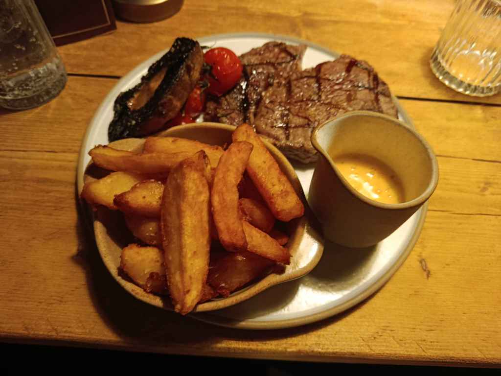 My choice was a 250g/8.8oz ribeye, cooked to my preferred doneness of rare, which might upset some readers to see, but to me there is no more perfect way of enjoying red meat than to eat it almost still alive and dripping with delicious juices. My partner’s choice of meat was a 300g/10.5oz sirloin cooked to a more sensible medium rare. Both were served with an upgraded side of beef dripping chips, roasted flat mushroom, and roasted cherry tomatoes on the vine.