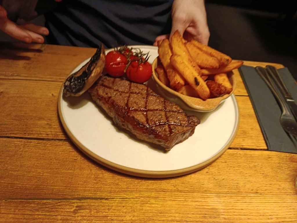 When it came to starters my partner and I shared so we were able to try a little of each other’s, but sadly this did not happen for our steaks as we were fully engrossed in the sheer amount of flavour they contained for each of us. The meat was cooked perfectly for my taste, the chips were crispy with the perfect amount of finishing salt added to them, the mushroom was surprisingly flavour packed, and whilst I did not indulge in a tomato myself due to a dislike of whole tomatoes, my partner told me even they had a big amount of flavour to them.